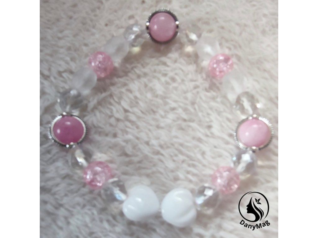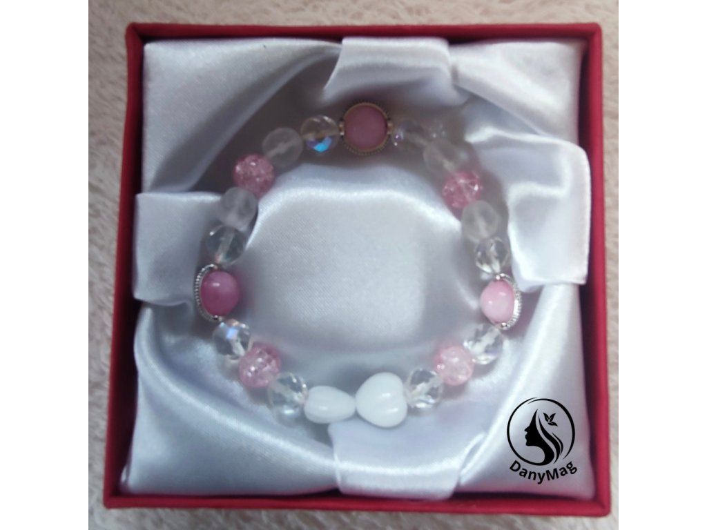 Jemný a harmonický náramek vyrobený ze skleněných korálků v růžové barvě s praskaným vzhledem, které doplňují mléčné broušené ohňovky a průsvitné broušené ohňovky. Design náramku zjemňují dvě bílá srdíčka symbolizující čistotu, lásku a něhu.