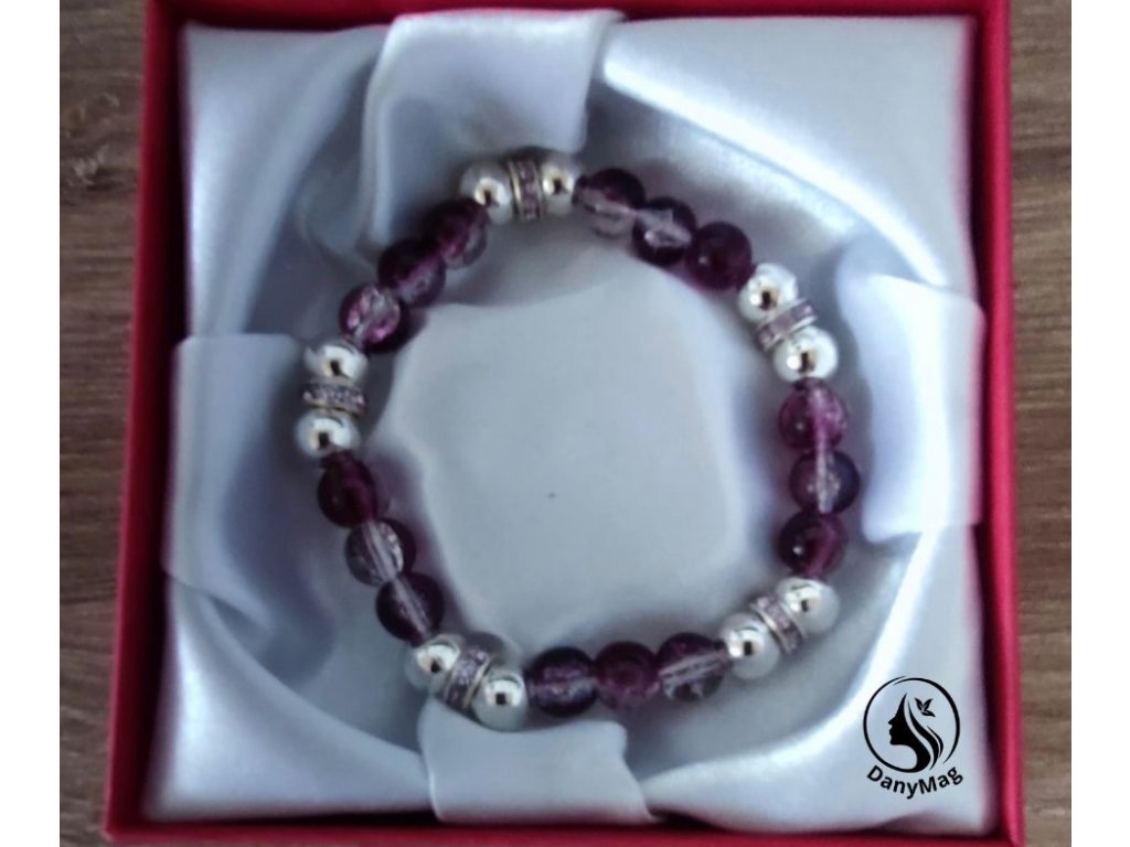 Náramek je vyroben ze skleněných korálků, fialové žíhané barvy, stříbrných korálků a doplněno stříbrnými, štrasovými rondelkami, přináší lehkost a hravost do života a nadhled v dané situaci. Je pružný od objemu ruky 16 cm. Tak jak se k náramku bude přistupovat, tak bude působit. Nedoporučuji kontakt s vodou, jen jednou za týden opláchnout ve studené vodě, aby se smyla negativní energie.