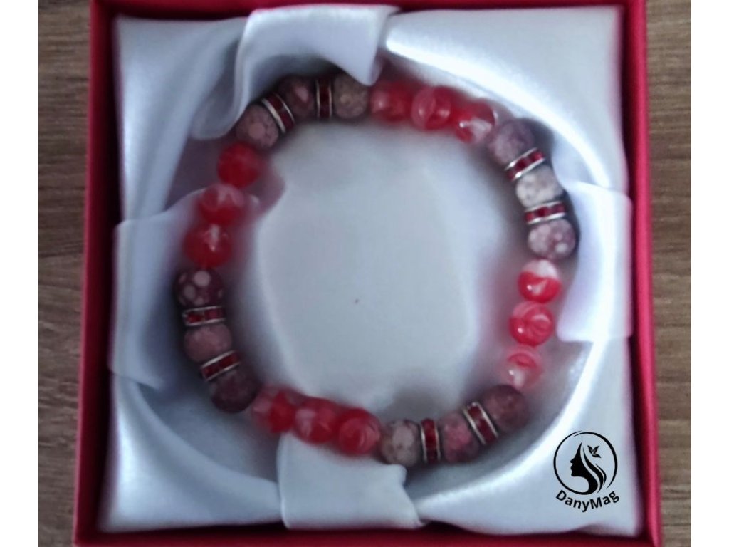 Náramek je vyroben ze skleněných korálků, žíhané červené barvy, doplněno tmavě červenými štrasovými rondelkami a korálky ze slunečného kamene, který přináší radost, pozitivní energii. Podporuje sebevědomí, optimismus a vnitřní sílu, pomáhá zahánět únavu. Je pružný od objemu ruky 17 cm. Tak jak se k náramku bude přistupovat, tak bude působit. Nedoporučuji kontakt s vodou, jen jednou za týden opláchnout ve studené vodě, aby se smyla negativní energie.