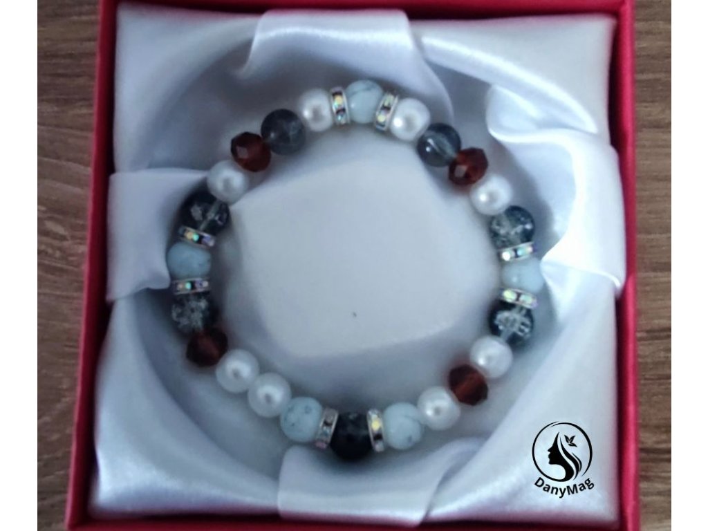 Náramek je vyroben ze skleněných korálků, žíhané černé barvy, hnědé broušené ohňovky, minerálními korálky z kamene magnezitu, přináší klid, rovnováhu a uvolnění. Zklidňuje mysl a napětí, podporuje trpělivost a vnitřní harmonii. Přitahuje sluníčko. Doplňkem jsou bílé perličky pro čistotu duše. A pro jemnost stříbrné, štrasové rondolky. Je pružný od objemu ruky 17 cm. Tak jak se k náramku bude přistupovat, tak bude působit. Nedoporučuji kontakt s vodou, jen jednou za týden opláchnout ve studené vodě, aby se smyla negativní energie.