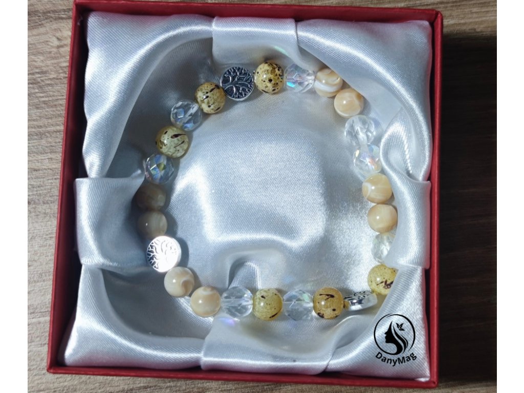 Náramek je vyroben ze skleněných korálků, světle béžové přírodní barvy a diamantových čirých korálků, které přitahují sluníčko, přináší harmonii a klid v kombinaci s doplňkem stromu života. Je pružný od objemu ruky 17 cm. Tak jak se k náramku bude přistupovat, tak bude působit. Nedoporučuji kontakt s vodou, jen jednou za týden opláchnout ve studené vodě, aby se smyla negativní energie.
