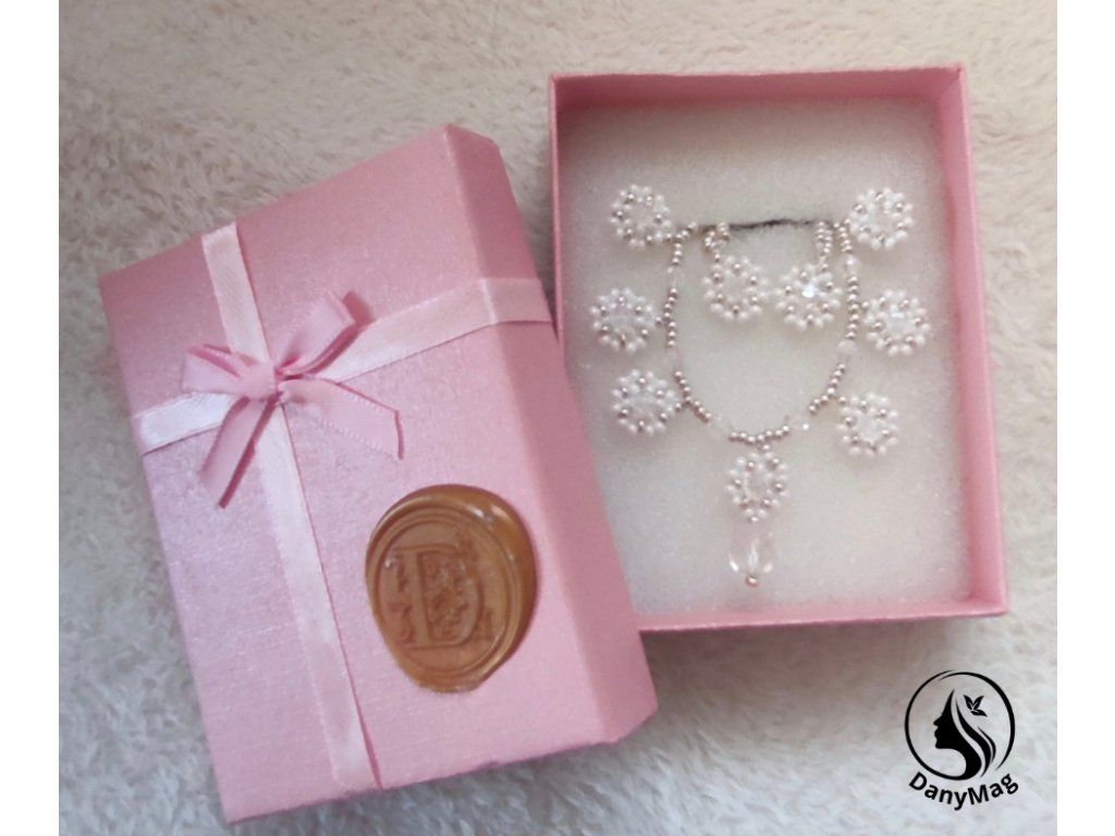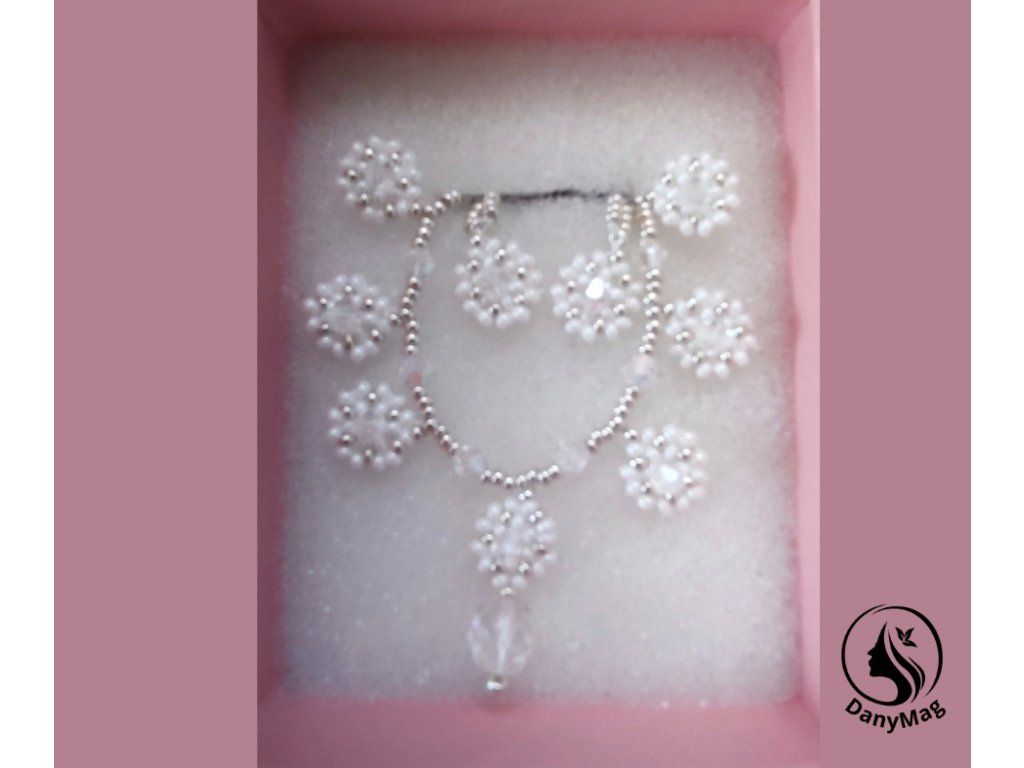 Pro tak výjimečný den jsem zvolila kombinaci materiálů, která dodává soupravě jemný, ale přesto nepřehlédnutelný lesk: bílé lesklé skleněné rocail korálky, stříbrno-zlaté rocail korálky a skleněné broušené ohňofky. Tyto prvky dodávají soupravě jemnost, sofistikovanost a elegantní třpyt.